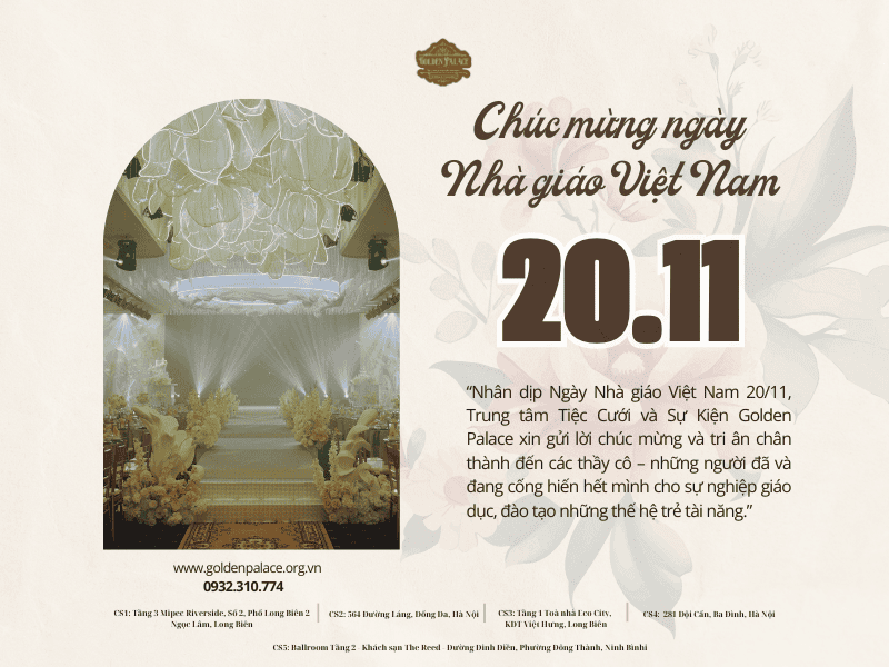 Nhân dịp Ngày Nhà giáo Việt Nam 20/11, Trung tâm Tiệc Cưới và Sự Kiện Golden Palace xin gửi lời chúc mừng và tri ân chân thành đến các thầy cô – những người đã và đang cống hiến hết mình cho sự nghiệp giáo dục, đào tạo những thế hệ trẻ tài năng.