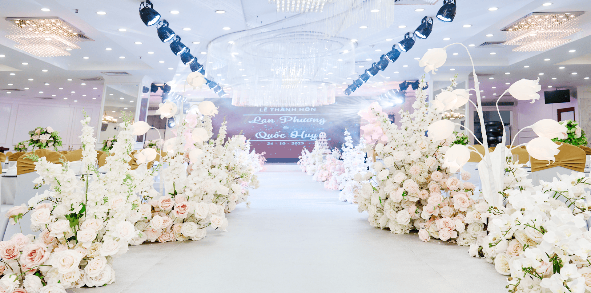 Đồng hành cùng hàng ngàn cặp đôi uyên ương suốt hành trình nhiều năm tiên phong trong lĩnh vực dịch vụ tiệc cưới, Golden Palace thấu hiểu được mong muốn hôn lễ cưới trở nên thật trọn vẹn nhưng vẫn bắt nhịp cuộc sống hiện đại của các cặp đôi tân hôn - không chỉ là chất xúc tác gia tăng không gian lung linh sang trọng cho buổi tiệc, mà còn truyền tải những thông điệp, ý nghĩa trọn vẹn qua từng đường nét thiết kế.